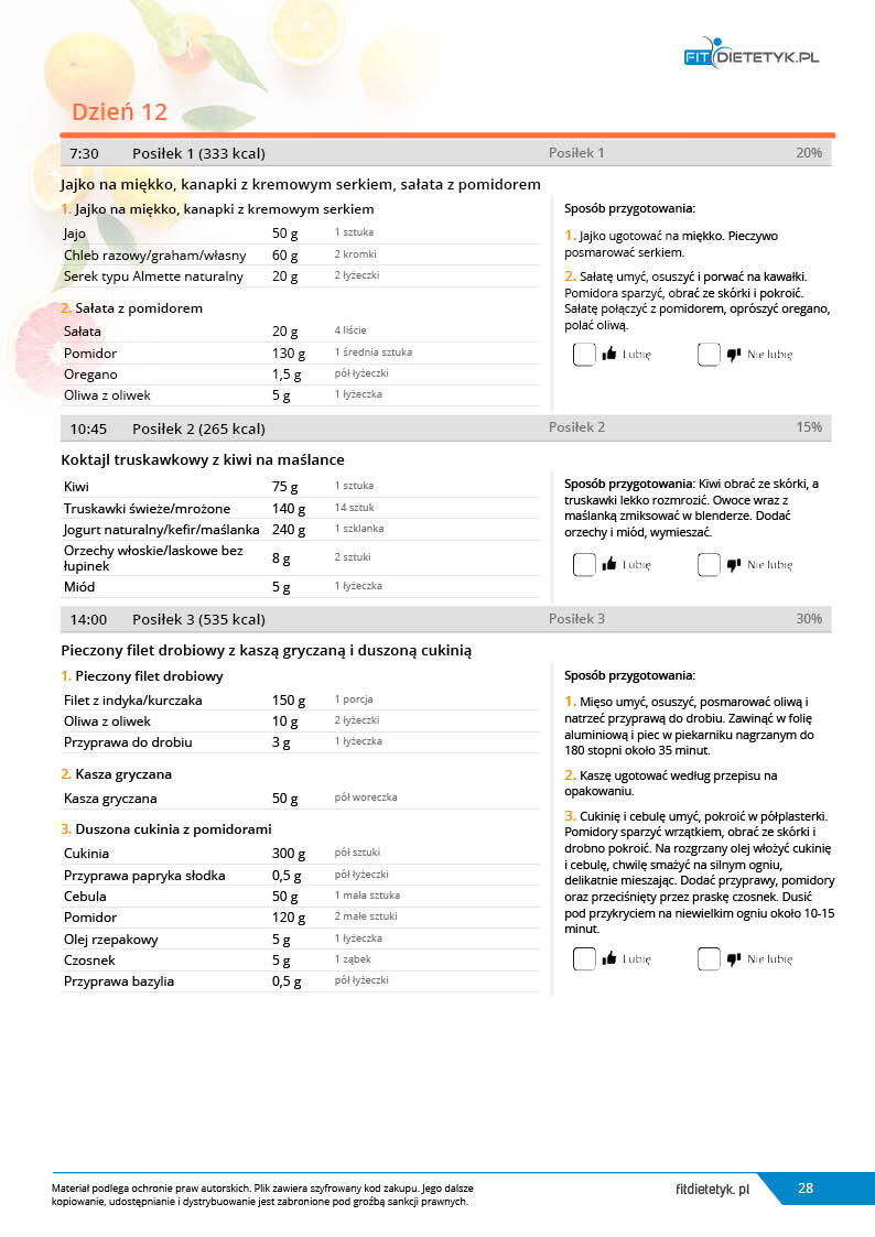 w formie propozycji posiłków (zamiast pojedynczych jadłospisów jednodniowych, przygotowano propozycje kilku propozycji dań na każdy posiłek). Tutaj nie uzależniamy Cię od tego jakie masz np. w danym dniu zjeść śniadanie czy obiad, tylko sam wybierasz sobie ulubione danie z kilku przedstawionych przez nas propozycji.