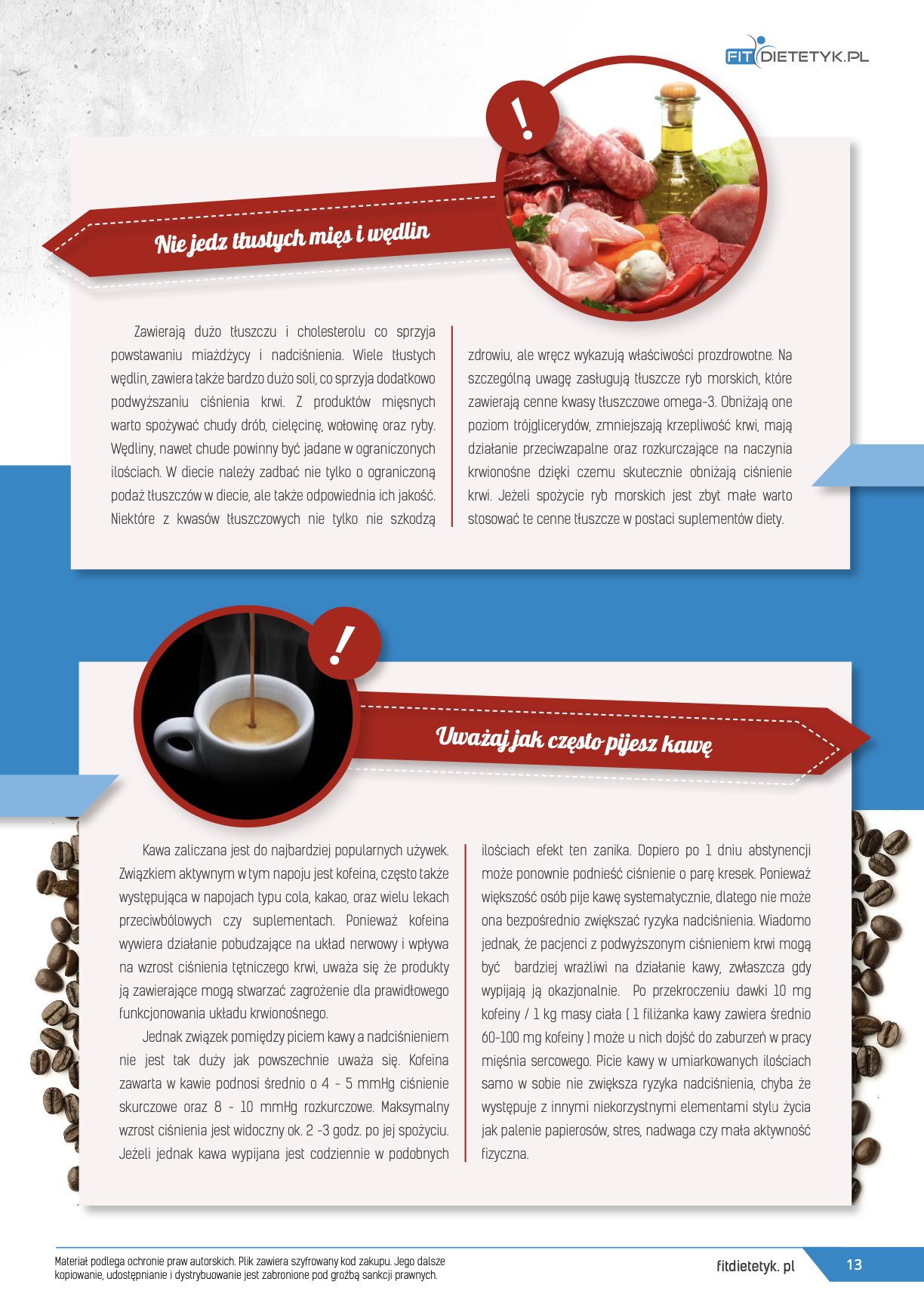 Kompleksowy program żywieniowy dla MĘŻCZYZNzmagających się z problemem nadciśnienia tętniczego. Opracowanie zawiera specjalnie przygotowany przewodnik edukacyjny oraz 30-dniowy jadłospiswspomagający redukcję podwyższonego ciśnienia krwi. W diecie zwrócono szczególną uwagę na podaż składników odżywczych wpływających na relaksację i zdrowie naczyń krwionośnych. Obok uwzględnienia ogólnych potrzeb żywieniowych mężczyzn, zadbano m.in. o podaż odpowiedniej ilości sodu potasu, zachowanie odpowiednich proporcji między tymi składnikami a także dostarczenie zwiększonej ilości kwasów omega-3, które wpływają na procesy rozkurczowe naczyń krwionośnych. W przygotowanej diecie zwrócono także uwagę na ograniczenie podaży składników o działaniu miażdżycorodnym a także zwiększono podaż witamin chroniących naczynia krwionośne przed uszkodzeniem. Dieta sprawdzi się także idealnie w programach redukcji wagi u mężczyzn, w chorobach układu krążenia a także jako dieta po zawale.