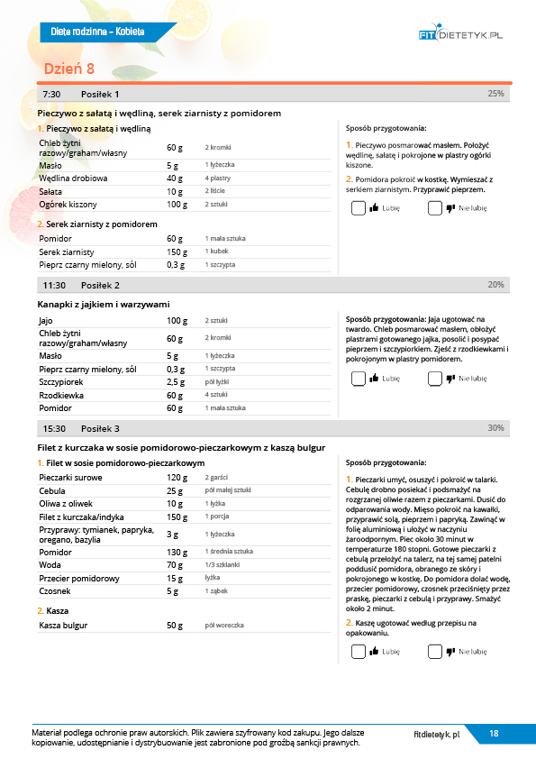 w formie propozycji posiłków (zamiast pojedynczych jadłospisów jednodniowych, przygotowano propozycje kilku propozycji dań na każdy posiłek). Tutaj nie uzależniamy Cię od tego jakie masz np. w danym dniu zjeść śniadanie czy obiad, tylko sam wybierasz sobie ulubione danie z kilku przedstawionych przez nas propozycji.