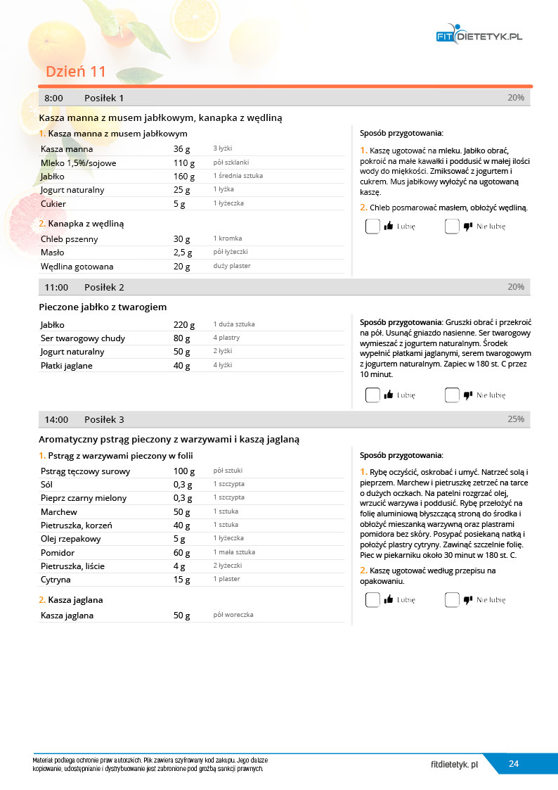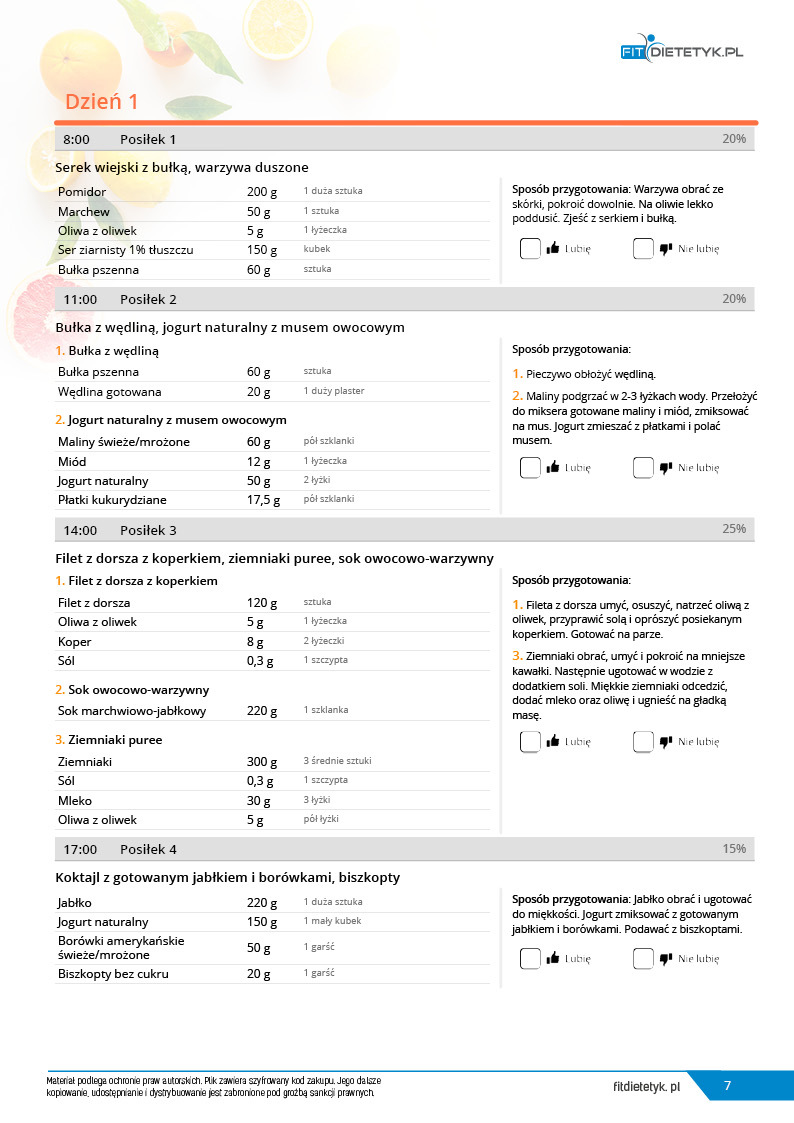w formie propozycji posiłków (zamiast pojedynczych jadłospisów jednodniowych, przygotowano propozycje kilku propozycji dań na każdy posiłek). Tutaj nie uzależniamy Cię od tego jakie masz np. w danym dniu zjeść śniadanie czy obiad, tylko sam wybierasz sobie ulubione danie z kilku przedstawionych przez nas propozycji.