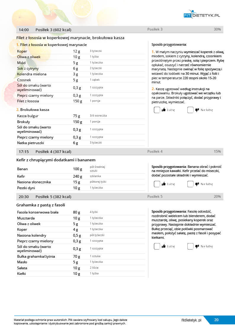 w formie propozycji posiłków (zamiast pojedynczych jadłospisów jednodniowych, przygotowano propozycje kilku propozycji dań na każdy posiłek). Tutaj nie uzależniamy Cię od tego jakie masz np. w danym dniu zjeść śniadanie czy obiad, tylko sam wybierasz sobie ulubione danie z kilku przedstawionych przez nas propozycji.