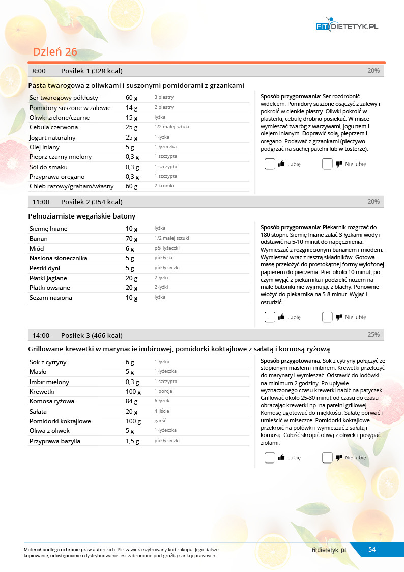 w formie propozycji posiłków (zamiast pojedynczych jadłospisów jednodniowych, przygotowano propozycje kilku propozycji dań na każdy posiłek). Tutaj nie uzależniamy Cię od tego jakie masz np. w danym dniu zjeść śniadanie czy obiad, tylko sam wybierasz sobie ulubione danie z kilku przedstawionych przez nas propozycji.