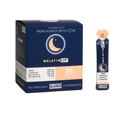 Doustny żel w technologii liposomalnej zawierający melatoninę, GABA, L-teaninę, fosfatydylocholinę, witaminę B6 i C.