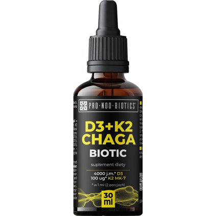 Suplement diety w kroplach, z witaminami D3, K2 MK-7, ekstraktem chagi i siedmioma szczepami pożytecznych bakterii. Produkt rekomendowany dla osób dorosłych.